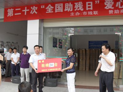 2010年5月18日,河源市匯源集團(tuán)向市殘聯(lián)捐贈輪椅30臺,以幫助30名殘疾人解決行走困難。市殘聯(lián)理事長在捐贈儀式上充分贊揚(yáng)了匯源集團(tuán)一貫以來給予殘疾人事業(yè)的大力支持!